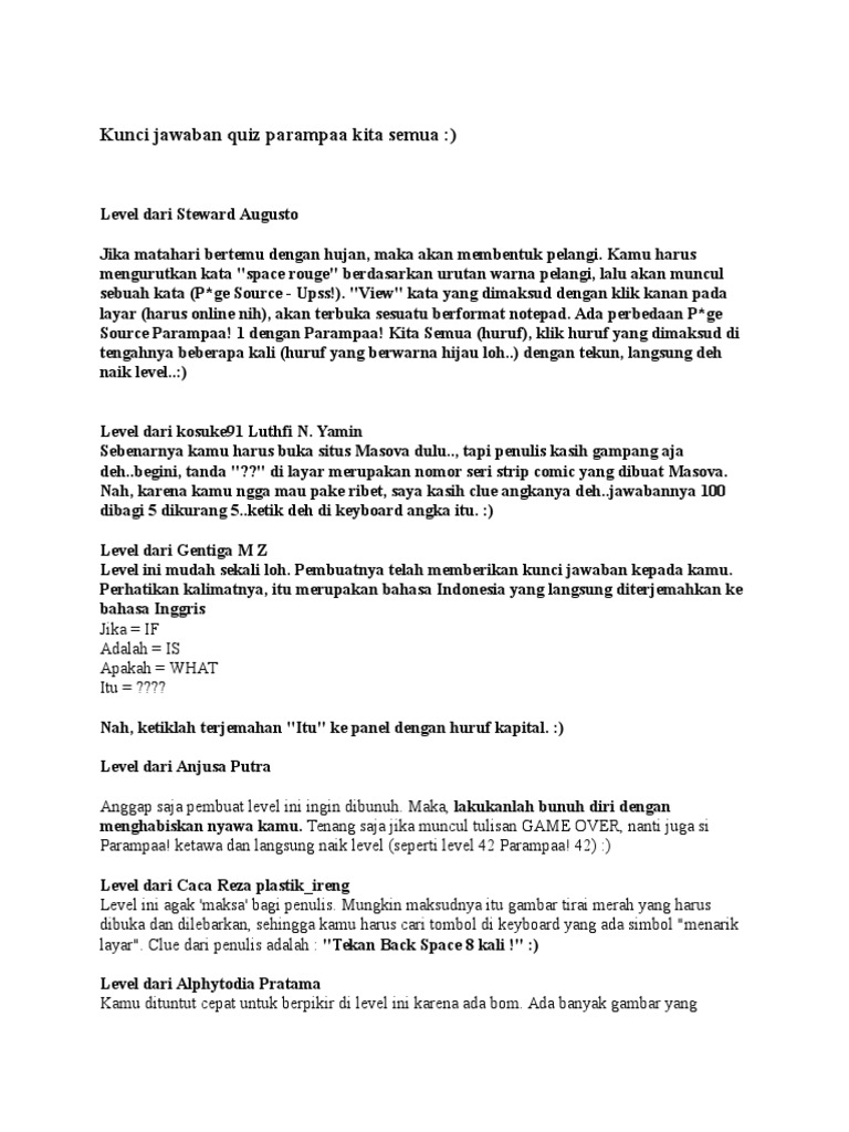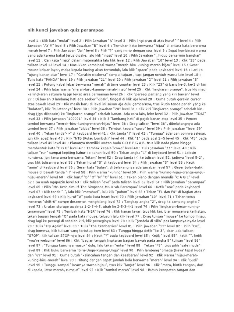 Lengkapnya Cheat Kunci Jawaban Quiz Parampaa Namatin from 2.bp.blogspot.com Kunci jawaban quiz parampaa 2 maret 1 mar 29 1 februari 1 feb 04 1 januari 2 jan 06 1. Quiz parampaa merupakan salah satu game pc ringan yang menjadi favorit banyak orang sekarang. Nama lagu wajib nasional 1. Klik huruf "o" sebanyak 20x. Kunci jawaban quiz parampaa level 1 100 kunci jawaban quiz parampaa 2 level 100 202. Password jawaban quiz parampaa 1 200 dan 3 kita semua unknown 01 01 cheat game 64 komentar dapet dari kaskus gan tentang trik. Berikut kunci jawaban brain test lengkap terbaru mulai dari level 1 hingga level 281 dengan bahasa indonesia dan cara yang mudah dimengerti. Oct 29, 2017 · quiz parampaa 3 (kita semua) level 1 :