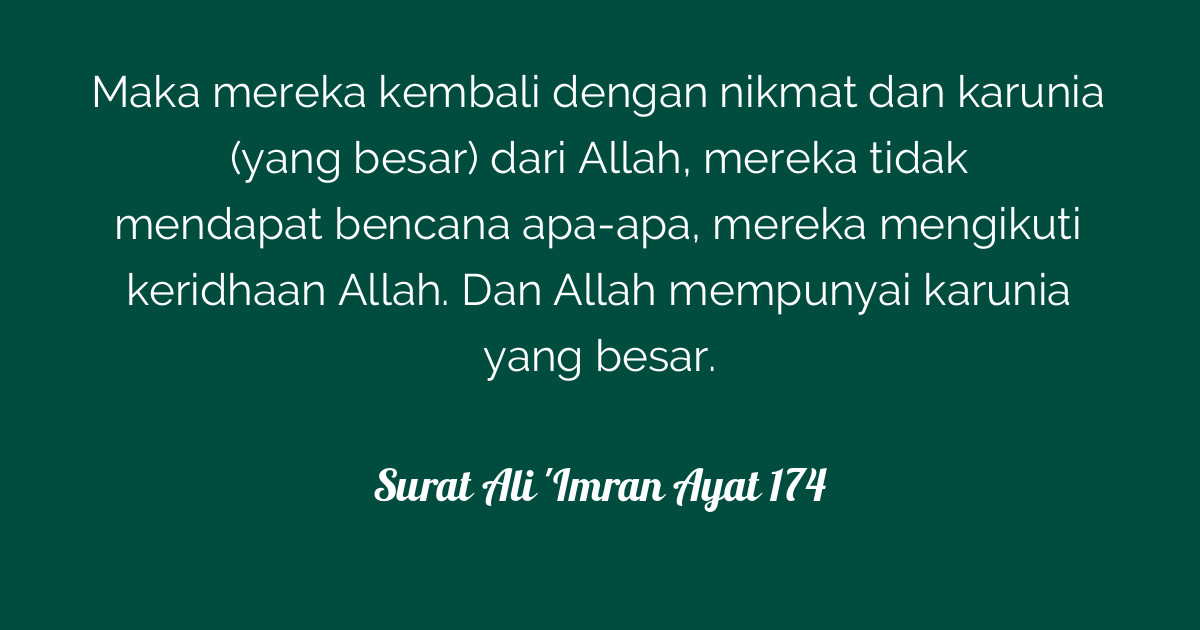 Pada surat ali imran 134, di atas berinfak di waktu lapang mengandung makna bahwa allah memberi banyak rezeki, sehingga dia memiliki harta yang banyak, . الَّذِينَ يُنْفِقُونَ فِي السَّرَّاءِ وَالضَّرَّاءِ وَالْكاظِمِينَ الْغَيْظَ . Artinya bahwa setelah amarah ditahan maka boleh dan dianjurkan untuk diungkapkan namun tetap dengan cara yang baik dan kepala dingin. Barang siapa menahan amarahnya, sedangkan dia mampu melaksanakannya, niscaya allah memenuhi rongganya dengan . Discover (and save!) your own pins on pinterest. Hendaklah orang yang mempunyai keluasan memberi nafkah menurut kemampuannya, dan orang yang terbatas rezekinya, hendaklah memberi nafkah dari . (ali imran:134) bahwa nabi saw.